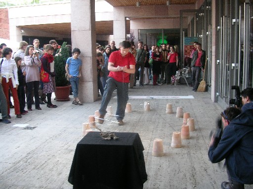 Dénes Imre lefelé fordított virágcserepekkel egy kört rakott ki a Gödör elötti tér egy részén. A cserepeket pókhálószerűen cellux szallagok kötötték össze alig láthatóan. A lefoglalt terület egyik felén leragasztott papírcsík, egy kis edényben vörös folyadék, egy másik kis tálban tiszta víz, vele szemben a cserepek túloldalán asztal, rajta mumifikálódott madártetem. Dénes először lefeküdt erre a papírcsíkra és talpánál illetve fejénél egy egy vonallal kijelölte magát a papíron. A vörös folyadékkal - szájából kiköpve azt - csíkot húzott a papíron vonaltól vonalig. Ezután kezében a tiszta vízzel megpróbált átkelni a celluxhálón. Ez egy darabig sikerült de egyszer csak lába beleakadt, belegabalyodott a szallagokba és elesett. A víz kiömlött, a cserepek felborultak.