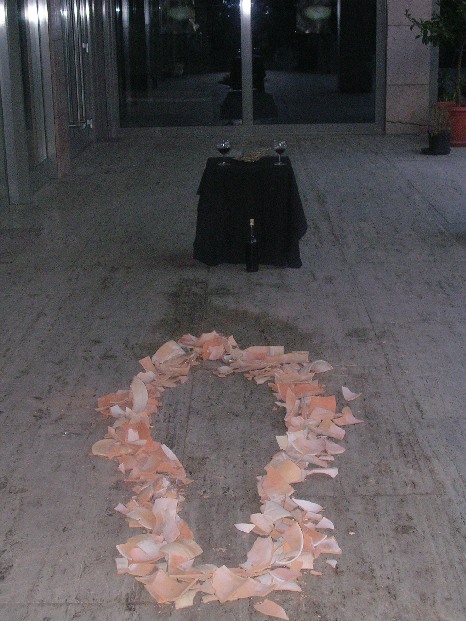 Ezután celluxxal betekerte a fejét és egy baltával az összes virágcserepet összetörte majd lefeküdt közéjük. Segítője szorosan a teste köré söpörte a cseréptörmeléket. Egy kis ideig így feküdt, majd felkelt és kiment. A törmelék egy ember alakját/hiányát rajzolta ki a kövön.