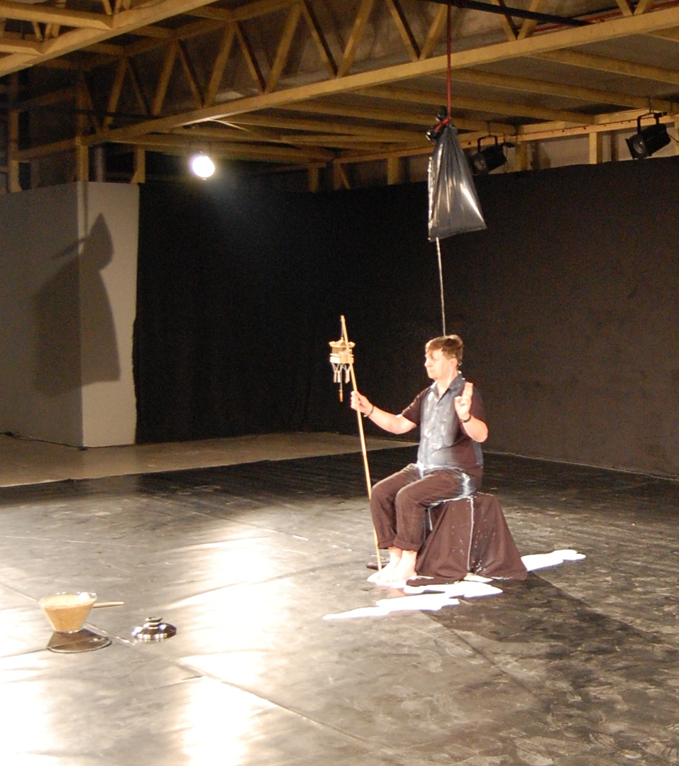 a harmadik többféle , kérő, könyörgő, áldó, óvó, megadó, elutasító, hívó stb., az utolsó pedig minden esetben kinyújtott kar és ökölbe szorított kéz. Közben mindvégig szólt az AYU monoton, kitartott férfihangokból álló zenéje. Aztán elfogyott a tej és amikor megállt a csorgás, a zene is leállt. Akkor Dénes előrébb lépett és egy vödör búzát öntött a korábban használt és a földre letett fedőre és fakanálra. Ismét felvette a madaras botot ám most bekapcsolta a kalitkában lévő kismadarat.