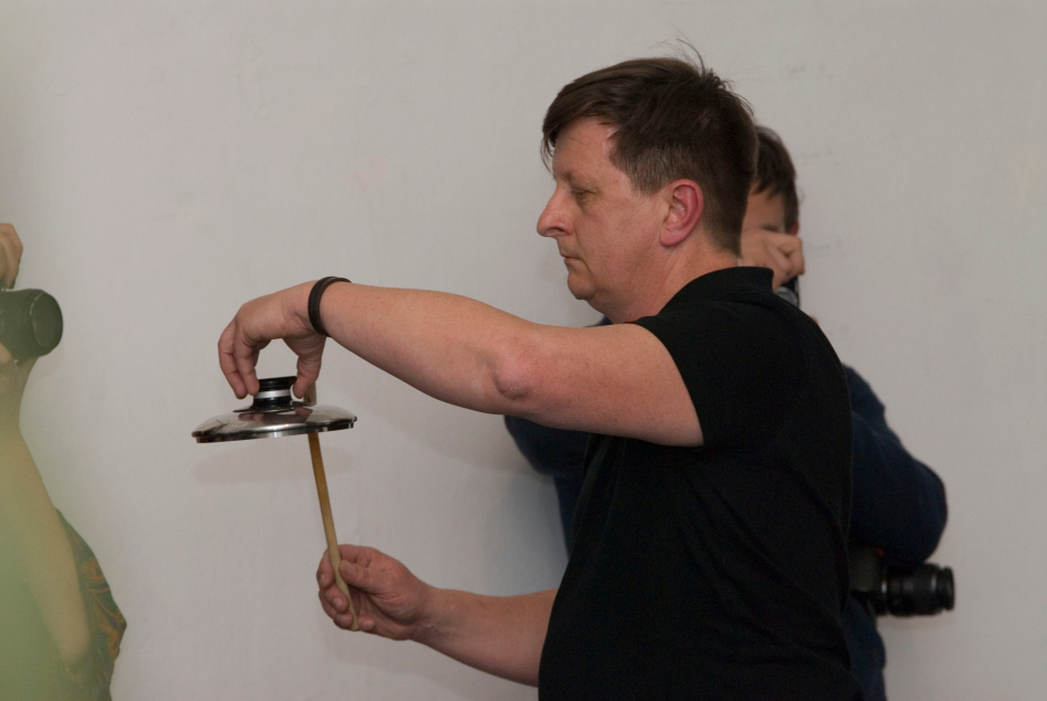 Egy fedőt fakanállal kongatva körbejárta a galéria terét, mezítláb, a szép zengő hang monoton ütemére lépdelt.