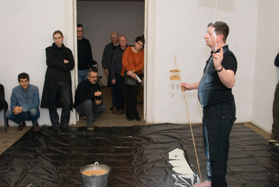 a harmadik többféle , kérő, könyörgő, áldó, óvó, megadó, elutasító, hívó stb., az utolsó pedig minden esetben kinyújtott kar és ökölbe szorított kéz. Közben mindvégig szólt az AYU monoton, kitartott férfihangokból álló zenéje. Aztán elfogyott a tej és amikor megállt a csorgás, a zene is leállt. Akkor Dénes előrébb lépett és egy vödör búzát öntött a korábban használt és a földre letett fedőre és fakanálra. Ismét felvette a madaras botot ám most bekapcsolta a kalitkában lévő kismadarat.
