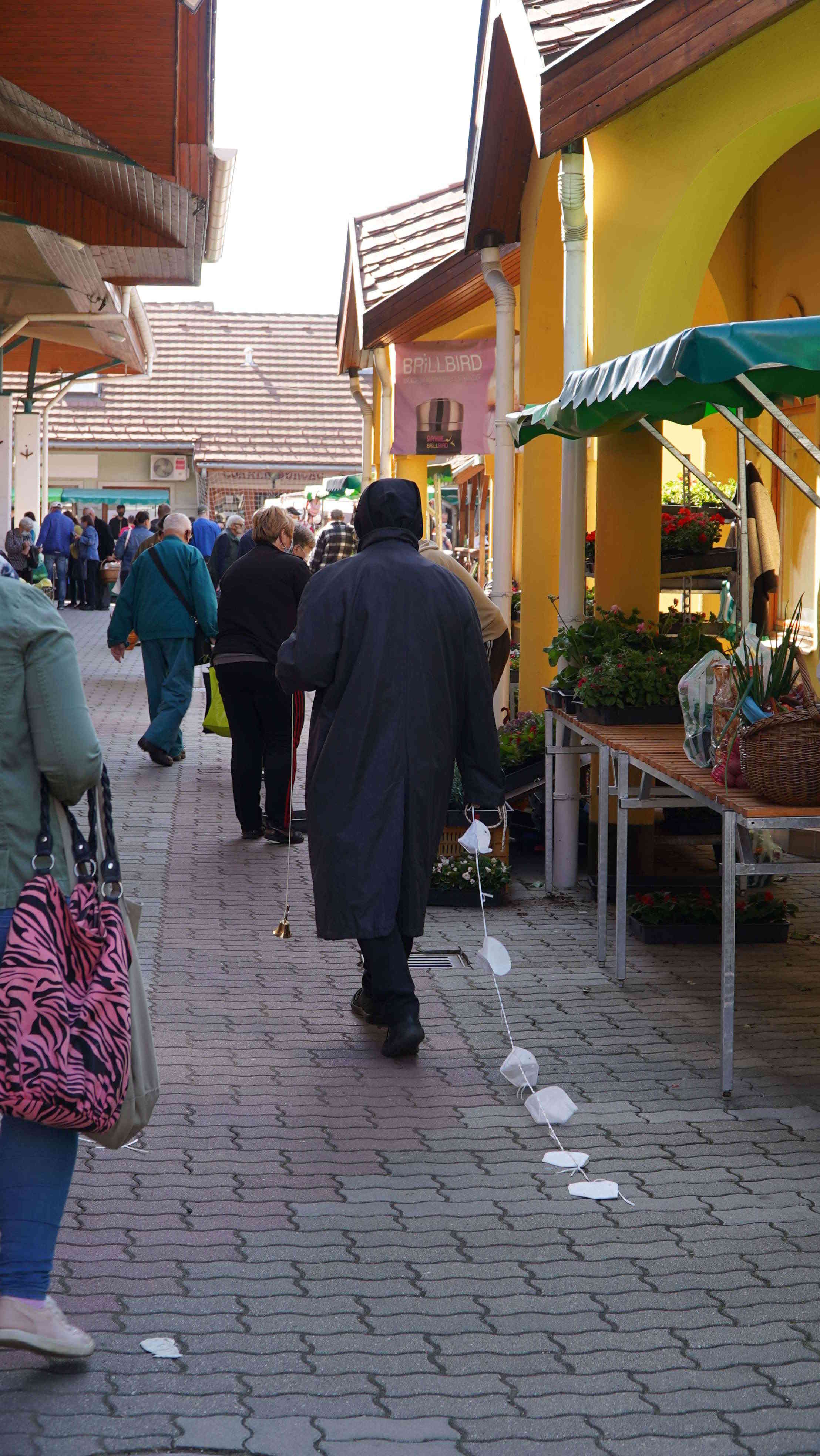 csilingel. Másik kezével összekötözött használt maszkok sorát húzza maga után a földön, így halad. Piacnap