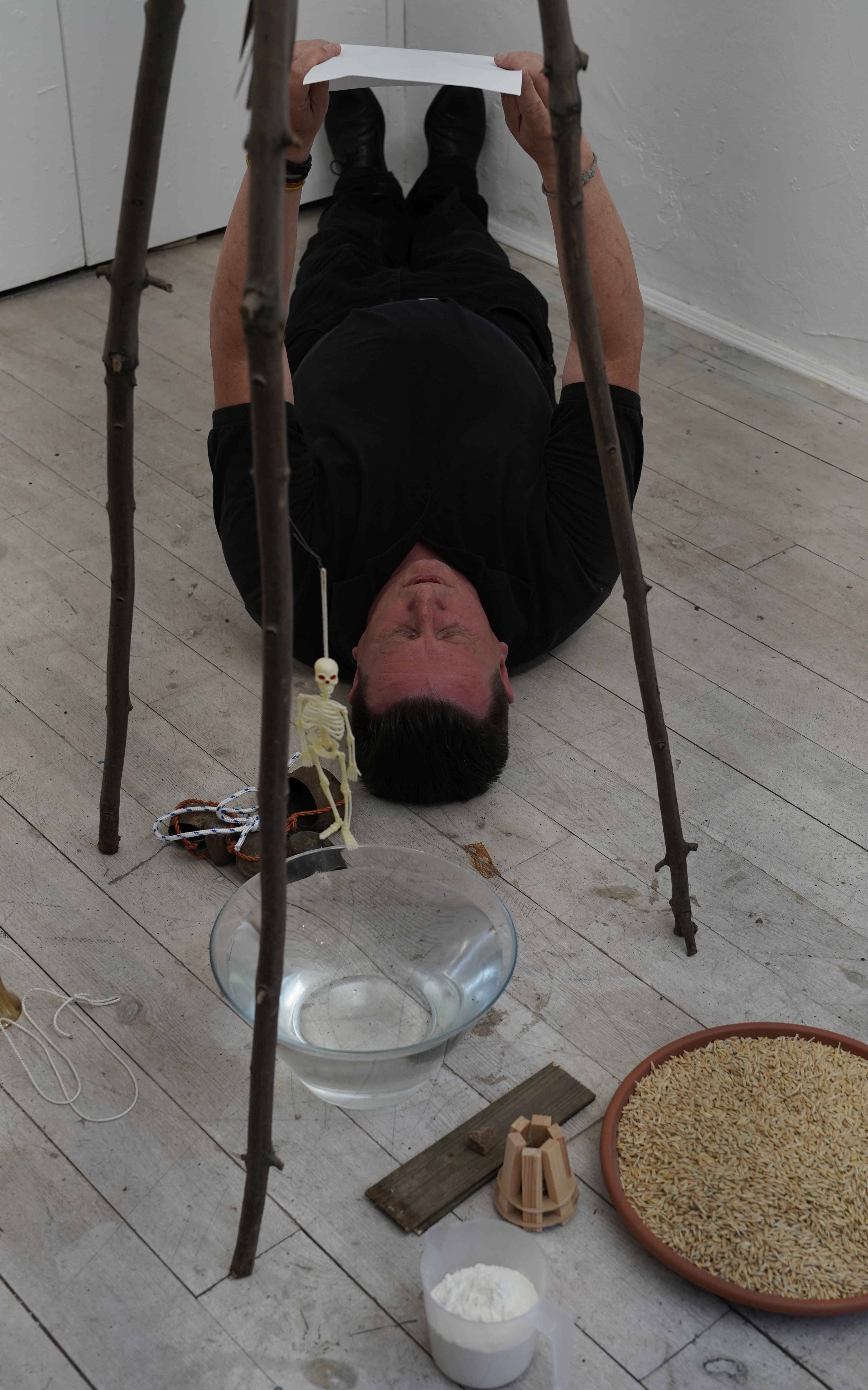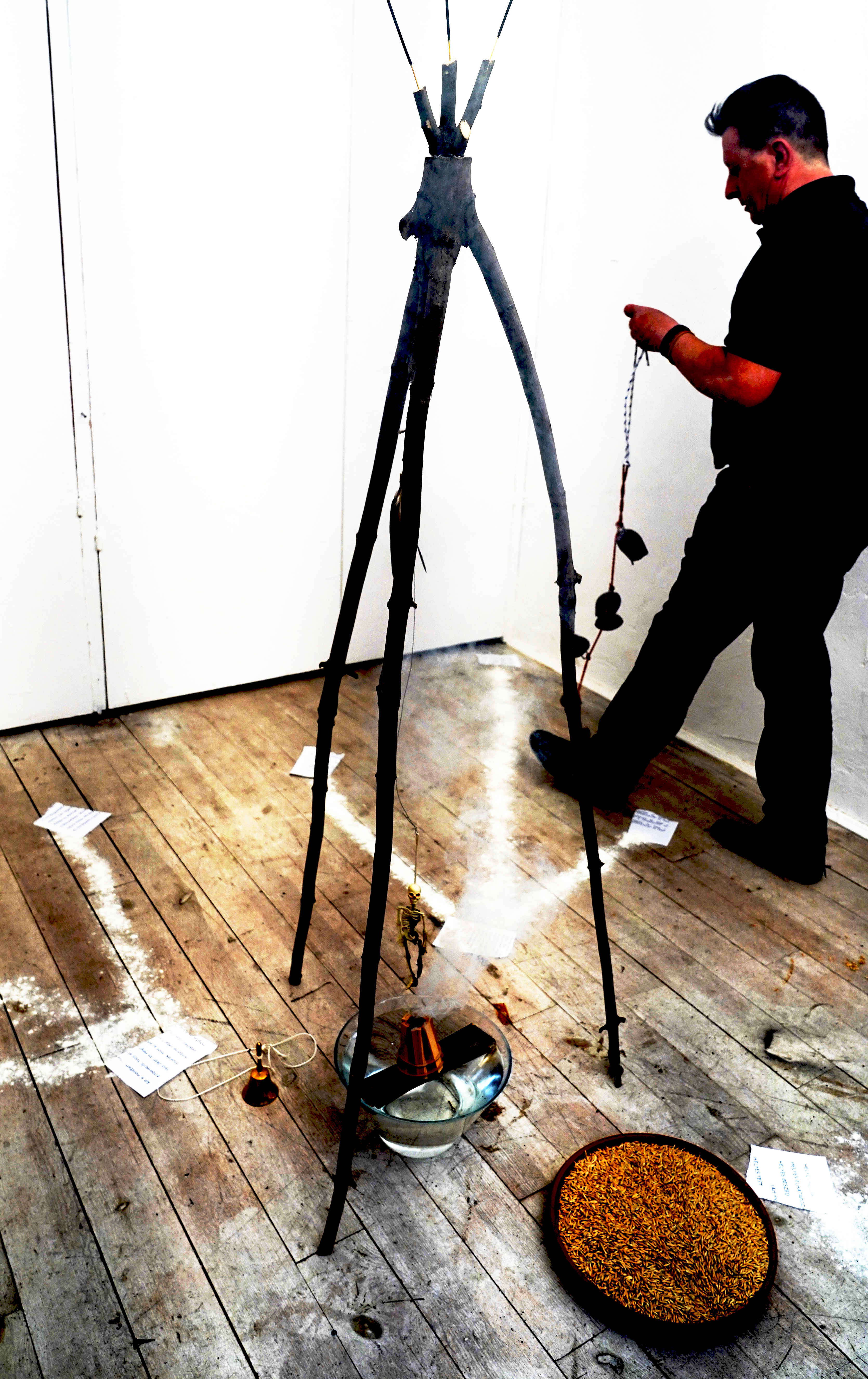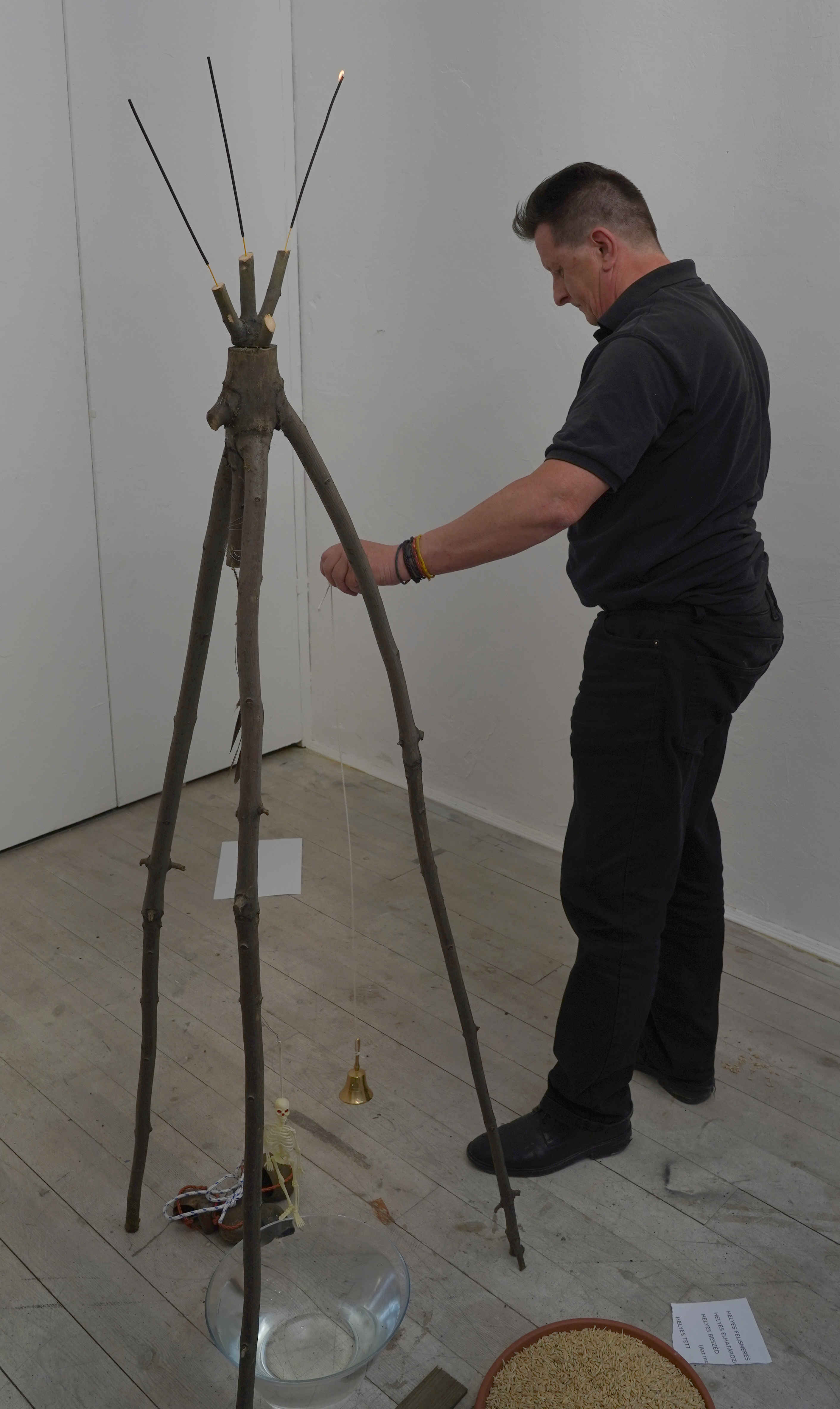 Dénes Imre háromlábú faágat állított a terem közepére. Tetején három füstölő. A lábak között vízzel teli tál mely fölé fenntről egy csontváz lóg le majdnem érintve a vizet. Odakészítve egy tálban valamilyen gabonaféle. A performansz sugár irányban 3 ismétlődő részből áll. Az egyes irányokban először végigcsengeti a sugárirány vonalát majd fejjel a közép felé hanyattfekszik és egy odakészített lapról felolvas. A felolvasás végén 4 részre összetépi a papírt és a darabokat 4 pontra leteszi. Meggyújt egy füstölőt. Ez történik tehát háromszor.