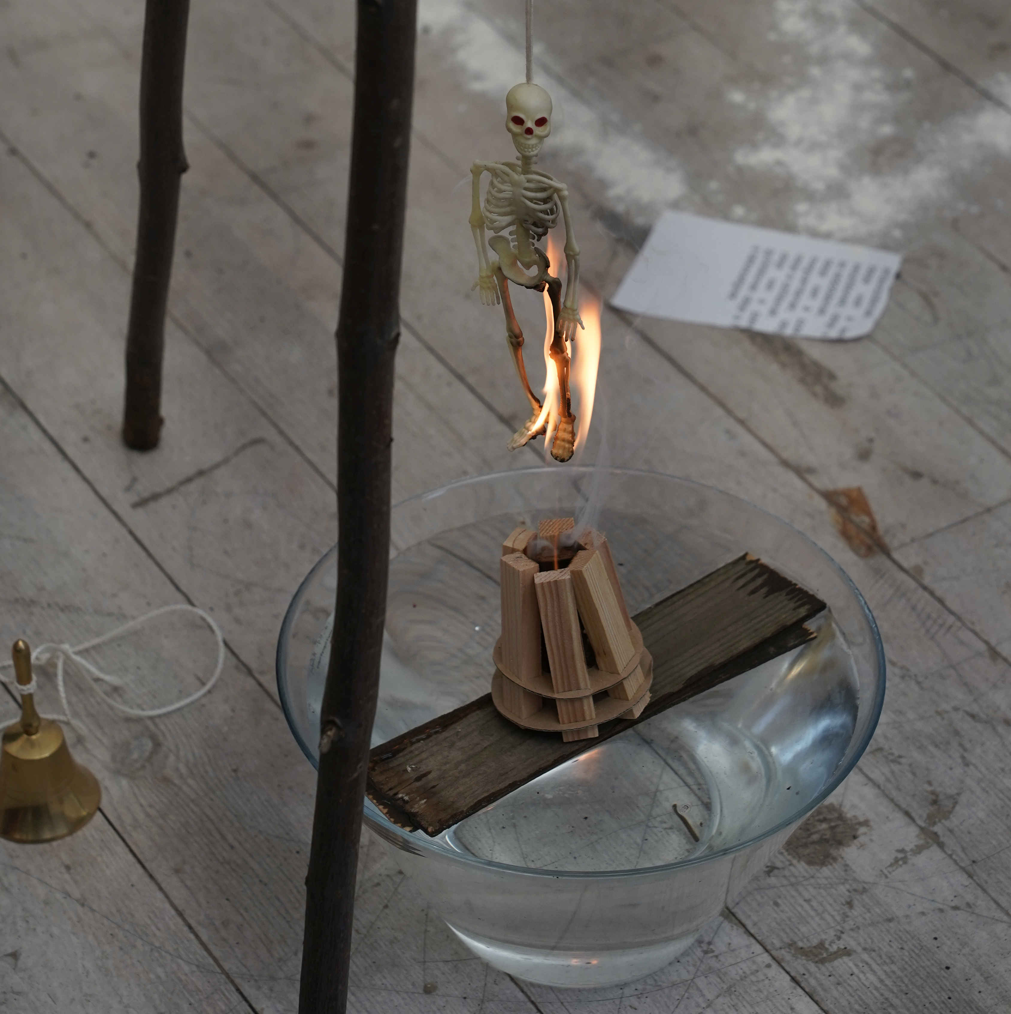 Ekkor gyújtóst tesz a vízfelszinre, meggyújtja és a lángoktól lángra kap a felette lógó csontváz. Amíg ez ég, hangosan kolompolva körbe-körbe jár. Végül a gabonát az egészre ráöntve