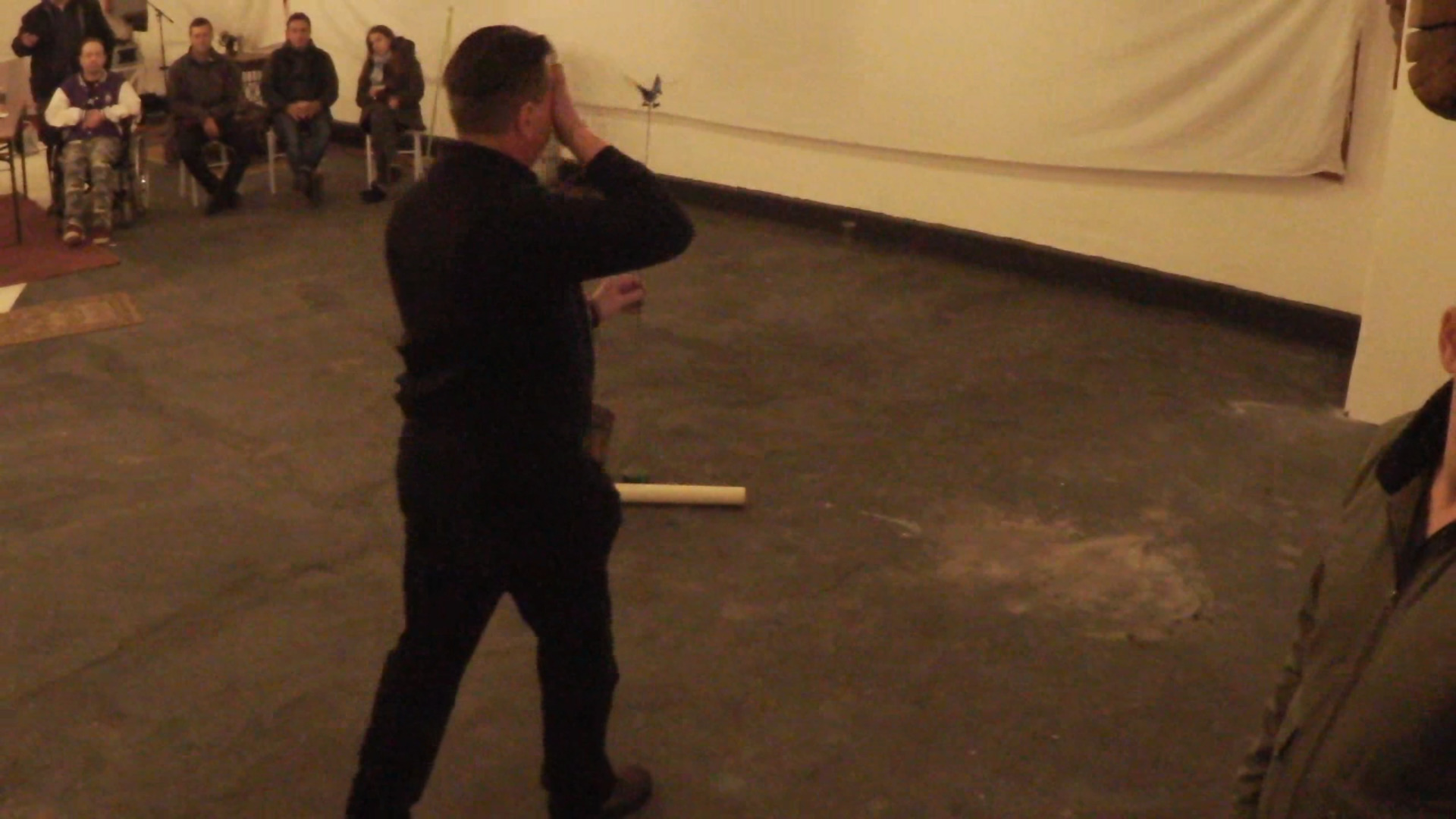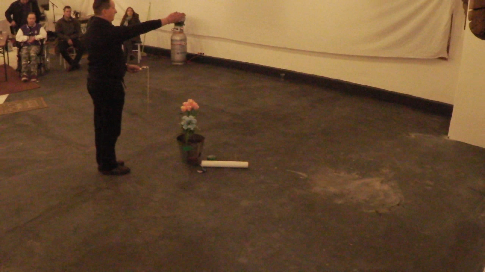 Bádog vödör, művirággal. Ez az a kezdőpont ahonnan Dénes Imre elindul kezében iránytűvel megkeresi a négy égtájat és karcsapással kijelöli azokat. Majd kezében egy szárnyait csapkodó kék madárral saját szemét befogva körbejár. Visszaérve egyfajta patetikus kézmodulattal a következő verset mondja: