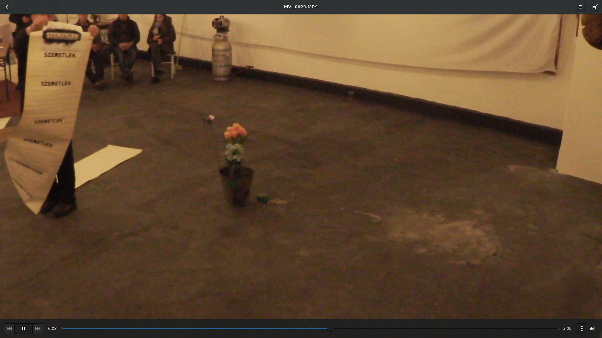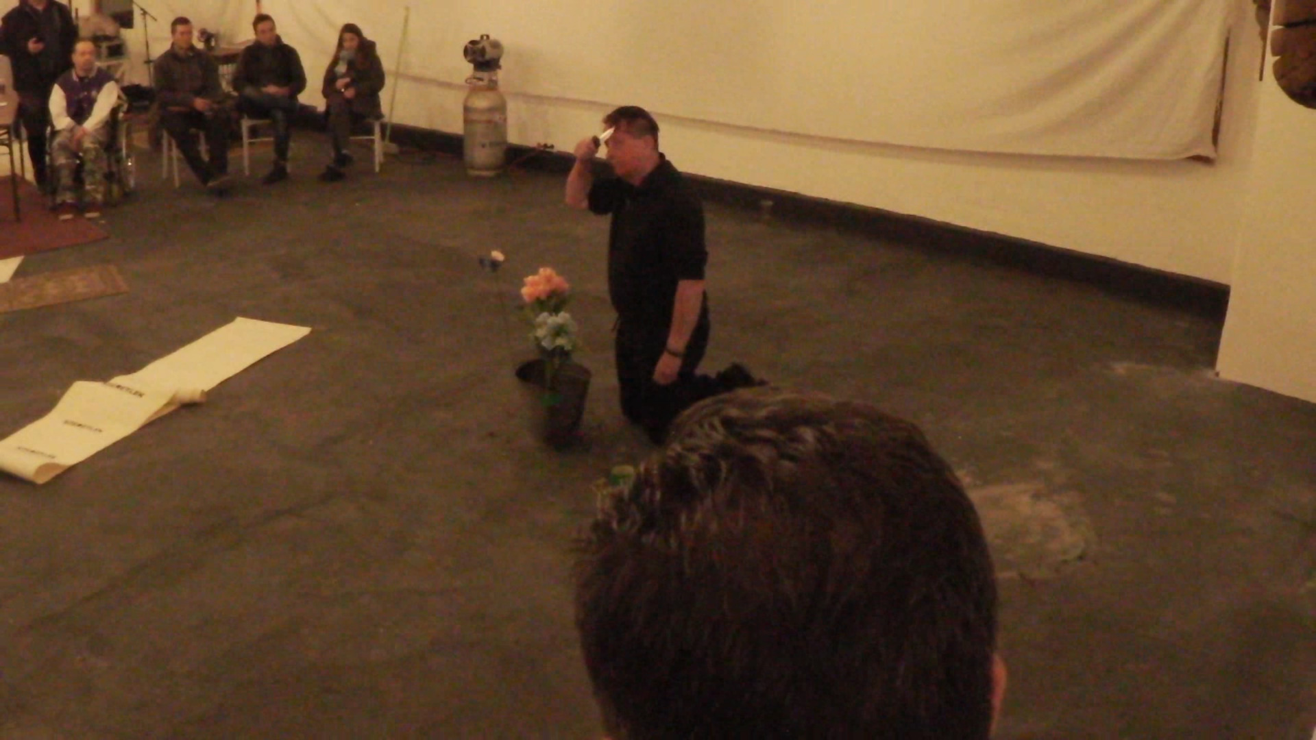 Ezután papírtekercset vesz elő azt lassan letekerve és a közönségnek mutatva járkál. A tekercsen időről időre a SZERETLEK szó bukkan elő. A papír letekerését egy acsarkodó hörgő, morgó kutyahang kiséri. A tekercs legvégén maga a feliratsablon is láthatóvá válik. Visszaérve a vödörhöz pirosra szinezett földdel arcát, kezét, karját mossa. Kés pengéjével végigsimítja az előbb említett testrészeket. Most a papírcsíkot belegyűri a vödörbe meggyújtja és egyik kezében a kést tartva, a másikkal tisztelegve elénekli az előbbi verset az utolsó sort addig ismételve amíg a lángok kialszanak. Így ér véget a performansz. (PLT17)
