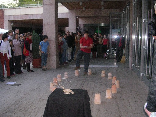 Dénes Imre lefelé fordított virágcserepekkel egy kört rakott ki a Gödör elötti tér egy részén. A cserepeket pókhálószerűen cellux szallagok kötötték össze alig láthatóan. A lefoglalt terület egyik felén leragasztott papírcsík, egy kis edényben vörös folyadék, egy másik kis tálban tiszta víz, vele szemben a cserepek túloldalán asztal, rajta mumifikálódott madártetem. Dénes először lefeküdt erre a papírcsíkra és talpánál illetve fejénél egy egy vonallal kijelölte magát a papíron. A vörös folyadékkal - szájából kiköpve azt - csíkot húzott a papíron vonaltól vonalig. Ezután kezében a tiszta vízzel megpróbált átkelni a celluxhálón. Ez egy darabig sikerült de egyszer csak lába beleakadt, belegabalyodott a szallagokba és elesett. A víz kiömlött, a cserepek felborultak.