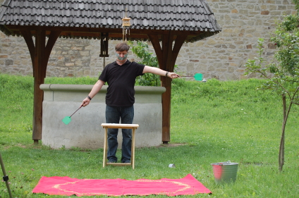 Hosszú botot vett fel, végére madárkalitka volt erősítve, és ezt lassan körbemutatta a közönségnek.