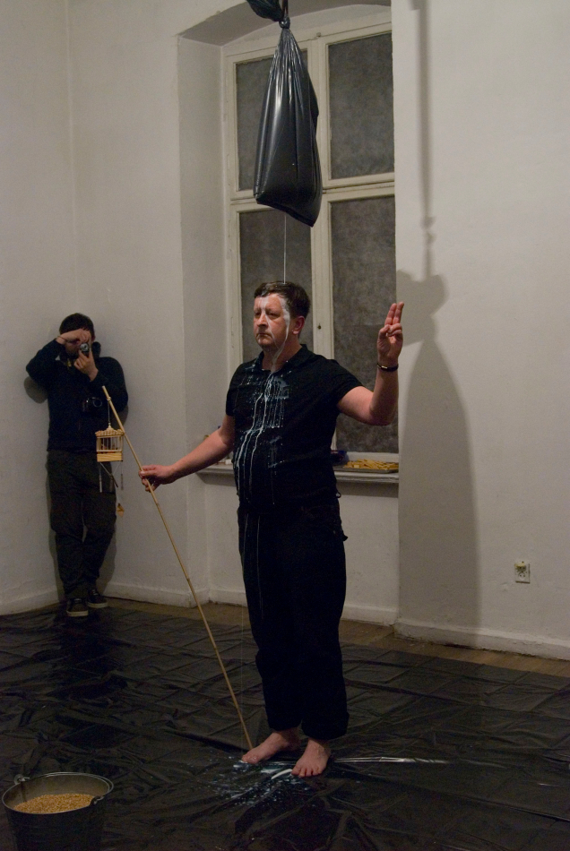 a harmadik többféle , kérő, könyörgő, áldó, óvó, megadó, elutasító, hívó stb., az utolsó pedig minden esetben kinyújtott kar és ökölbe szorított kéz. Közben mindvégig szólt az AYU monoton, kitartott férfihangokból álló zenéje. Aztán elfogyott a tej és amikor megállt a csorgás, a zene is leállt. Akkor Dénes előrébb lépett és egy vödör búzát öntött a korábban használt és a földre letett fedőre és fakanálra. Ismét felvette a madaras botot ám most bekapcsolta a kalitkában lévő kismadarat.