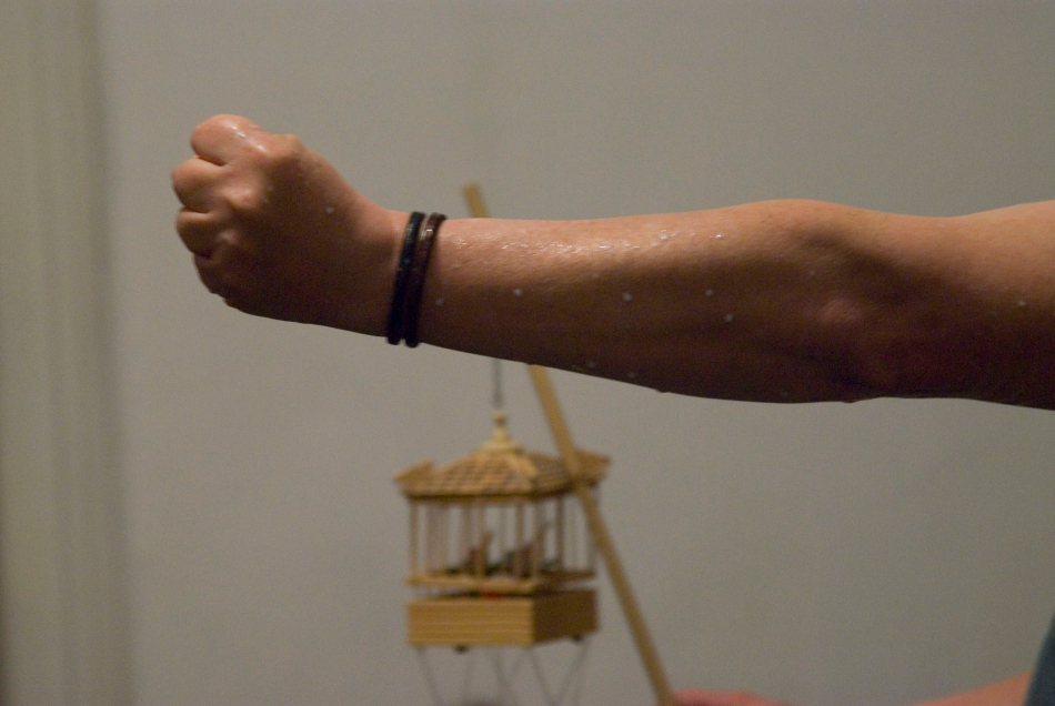 Hosszú botot vett fel, végére madárkalitka volt erősítve, és ezt lassan körbemutatta a közönségnek.