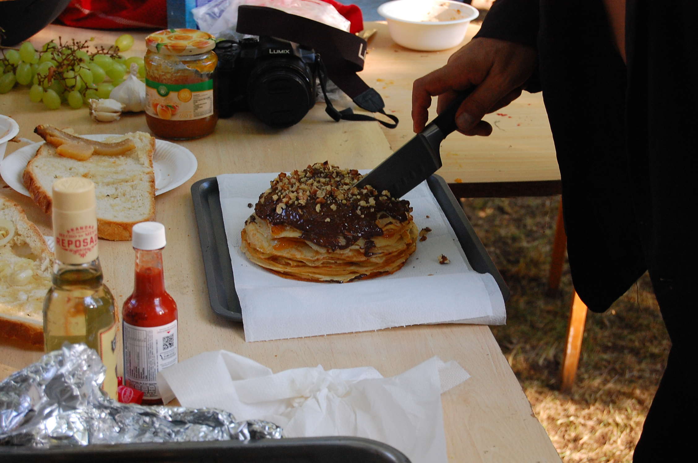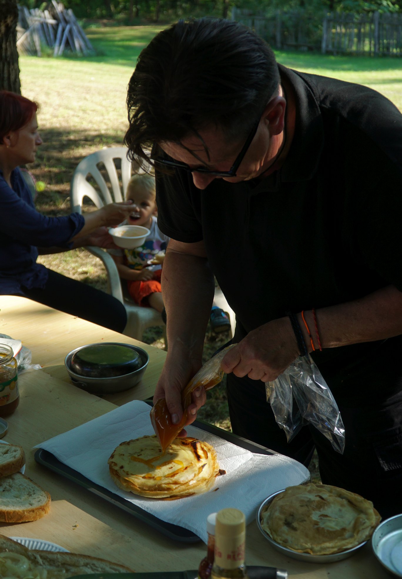 Ez az ember nekiáll palacsintát sütni a saját tűzhelyénél. Sok palacsintát süt. Azután a palacsintákat a