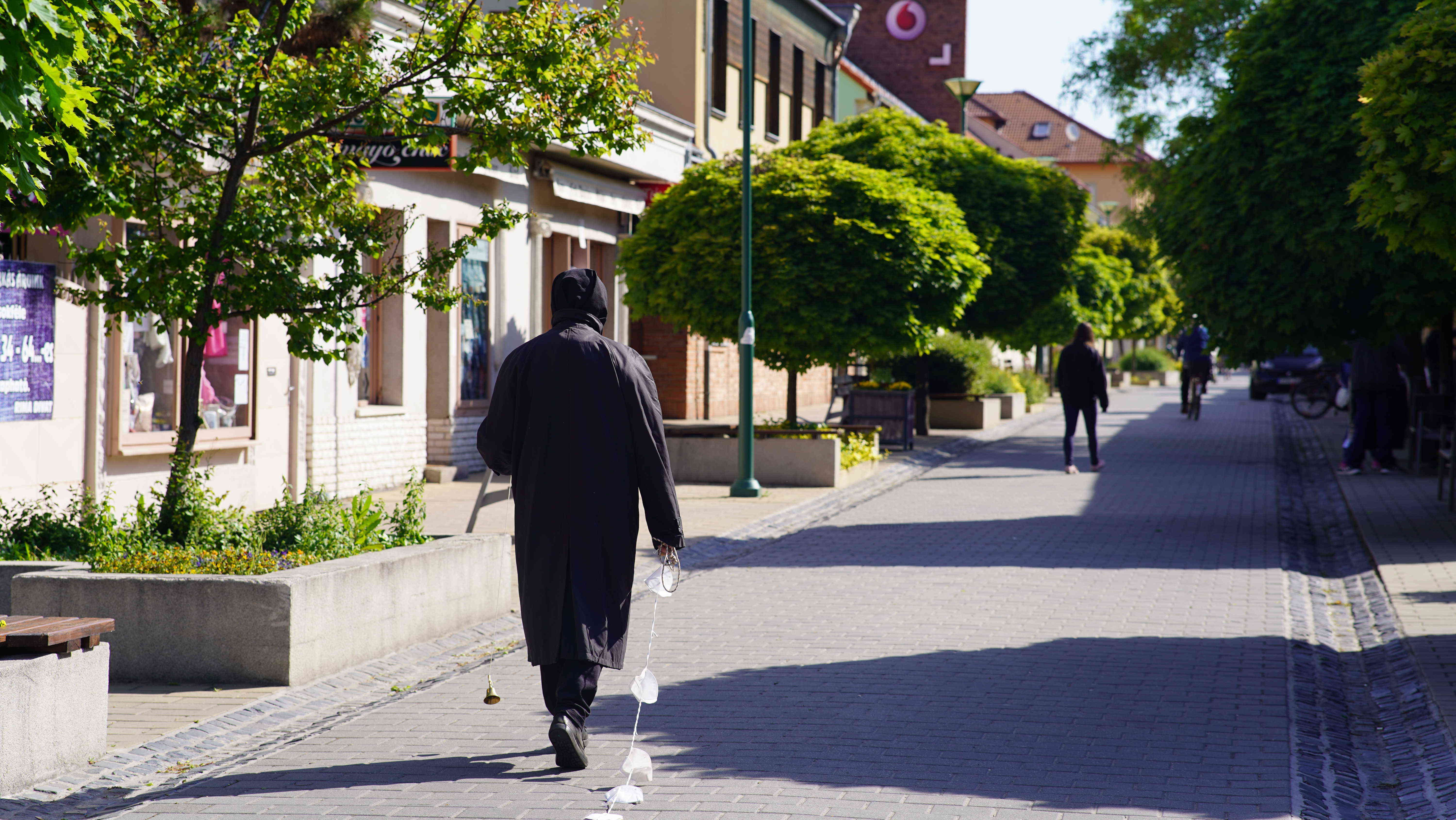csilingel. Másik kezével összekötözött használt maszkok sorát húzza maga után a földön, így halad. Piacnap