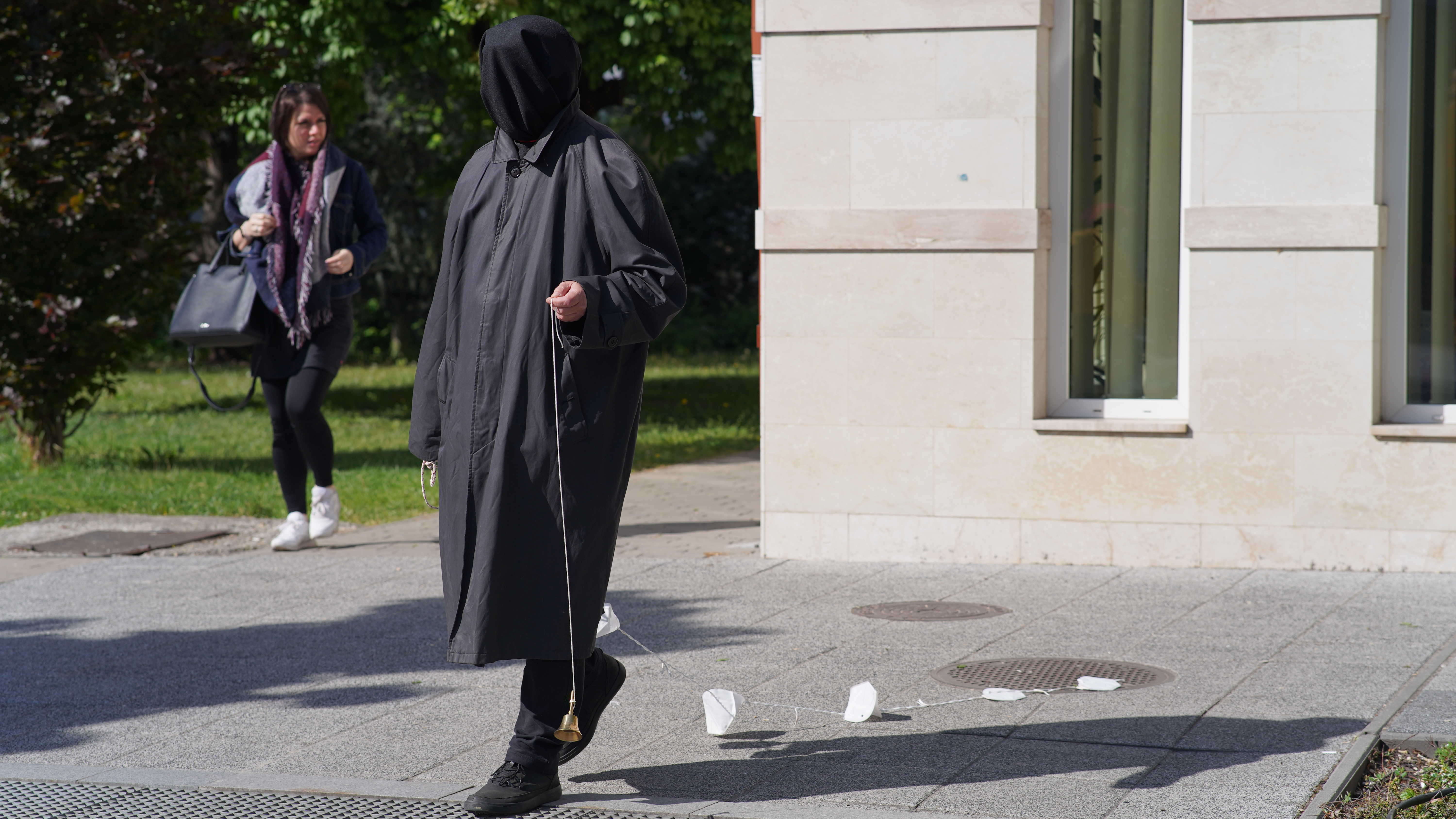 Fekete ruhába öltözött ember sétál az árusok között, nem látom az arcát, fejét fekete vászonnal bugyolálta