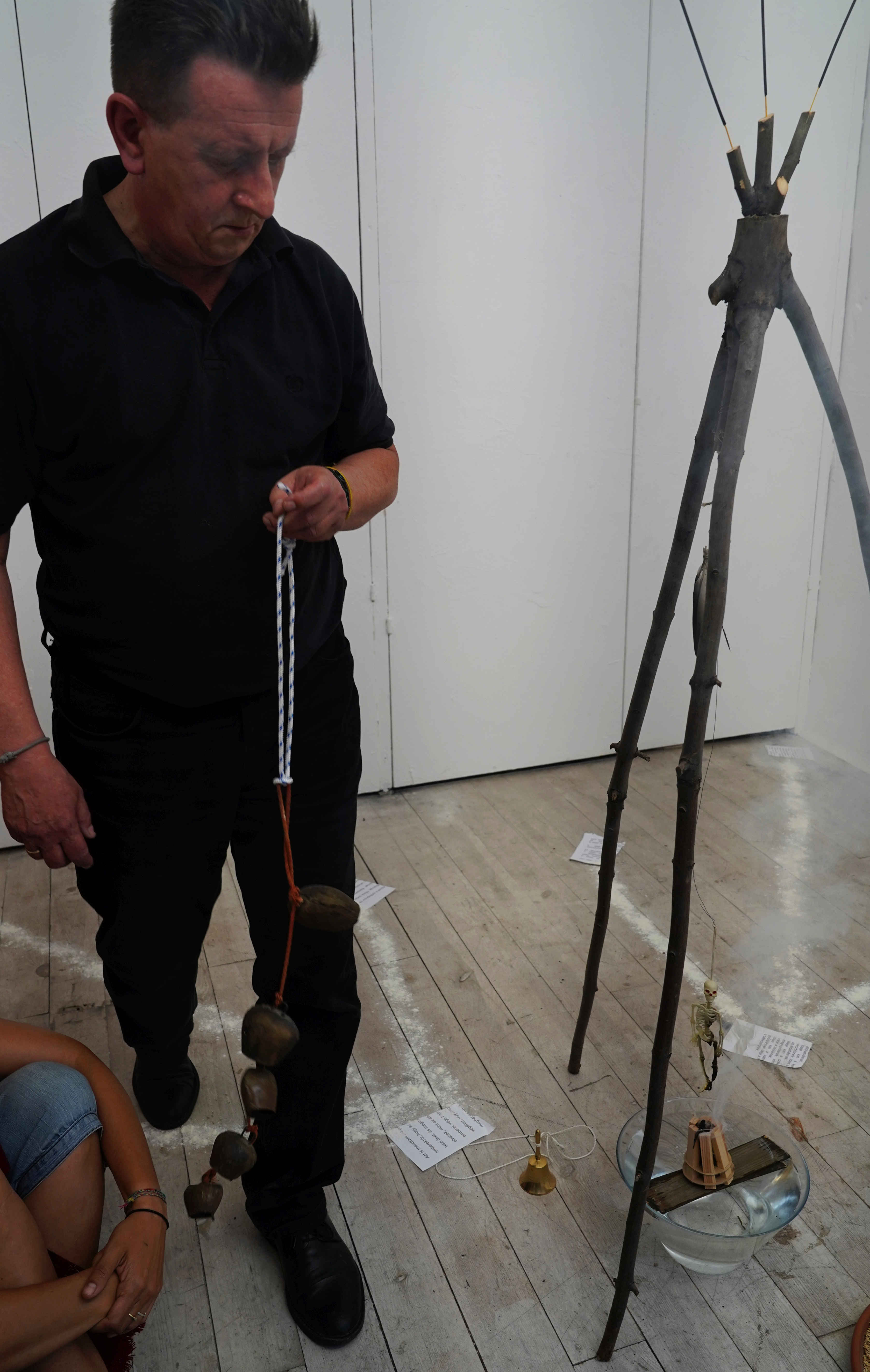Dénes Imre háromlábú faágat állított a terem közepére. Tetején három füstölő. A lábak között vízzel teli tál mely fölé fenntről egy csontváz lóg le majdnem érintve a vizet. Odakészítve egy tálban valamilyen gabonaféle. A performansz sugár irányban 3 ismétlődő részből áll. Az egyes irányokban először végigcsengeti a sugárirány vonalát majd fejjel a közép felé hanyattfekszik és egy odakészített lapról felolvas. A felolvasás végén 4 részre összetépi a papírt és a darabokat 4 pontra leteszi. Meggyújt egy füstölőt. Ez történik tehát háromszor.