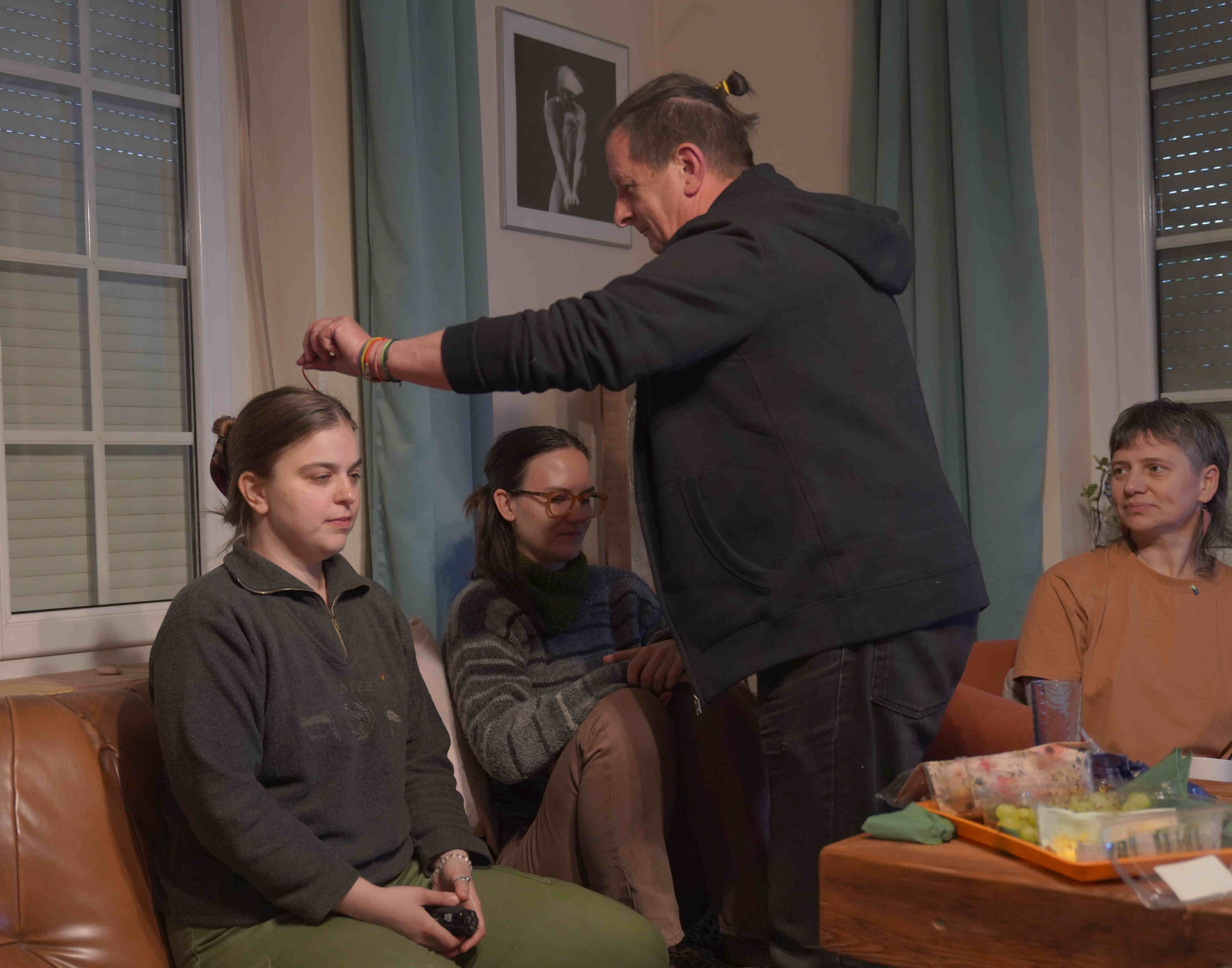 Majd piros fonalat vett elő és ezt a fonalat az összes jelenlévő vállán-fején-karján végighúzta.
